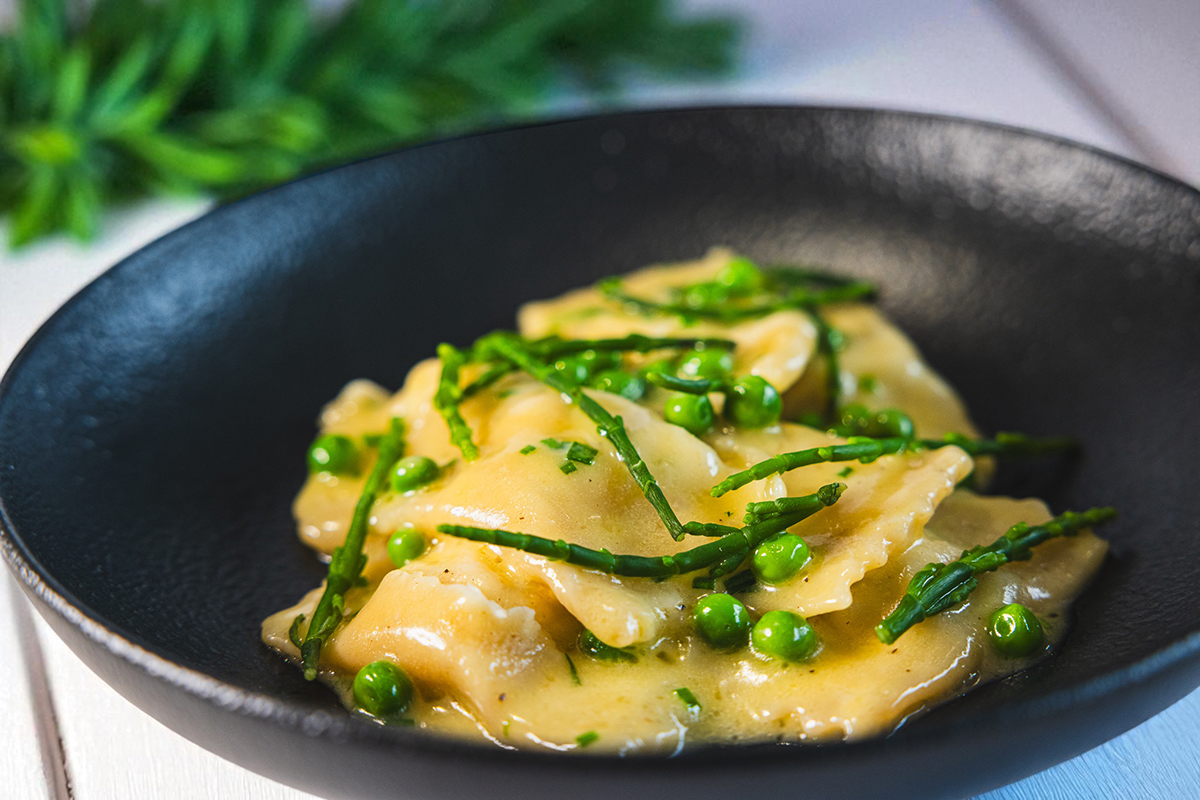 Alaska Salmon Agnolotti, Chive Butter Sauce, Peas